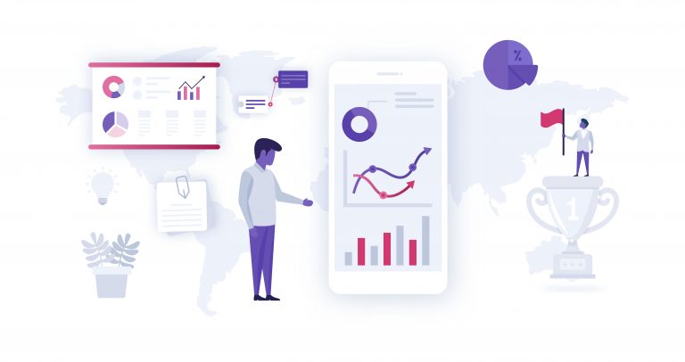 In this market report illustration you can find businessman presenting data on mobile screen having clear depiction of successful entrepreneur. Get this vector free at a single click!