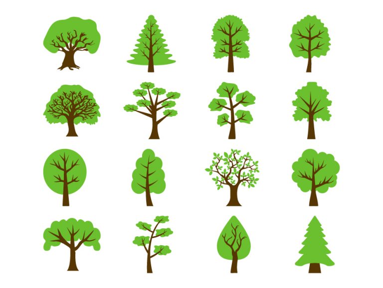 Tree drawing, flat icons of trees set. The attached folder contains AI, EPS, JPG files. Available for instant download.